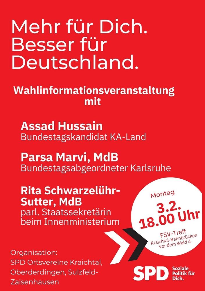 Die SPD Ortsvereine Kraichtal, Oberderdingen und Sulzfeld-Zaisenhausen laden ein zur SPD Wahlinformationsveranstaltung.